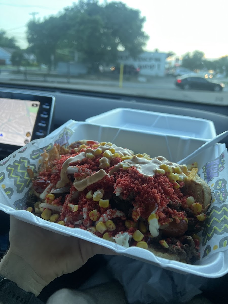 Melted Cheese, Loaded With Your Choice of Protein Loaded Corn With Hot Cheetos Sausage wrapped in bacon grilled onion mayo mustard Ketchup Magic sauce